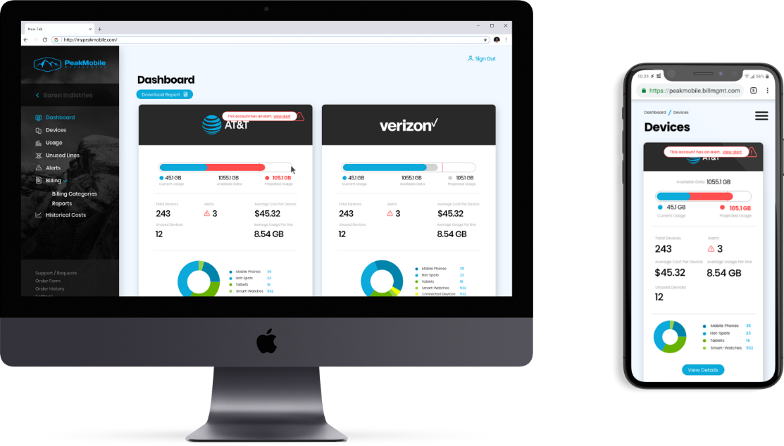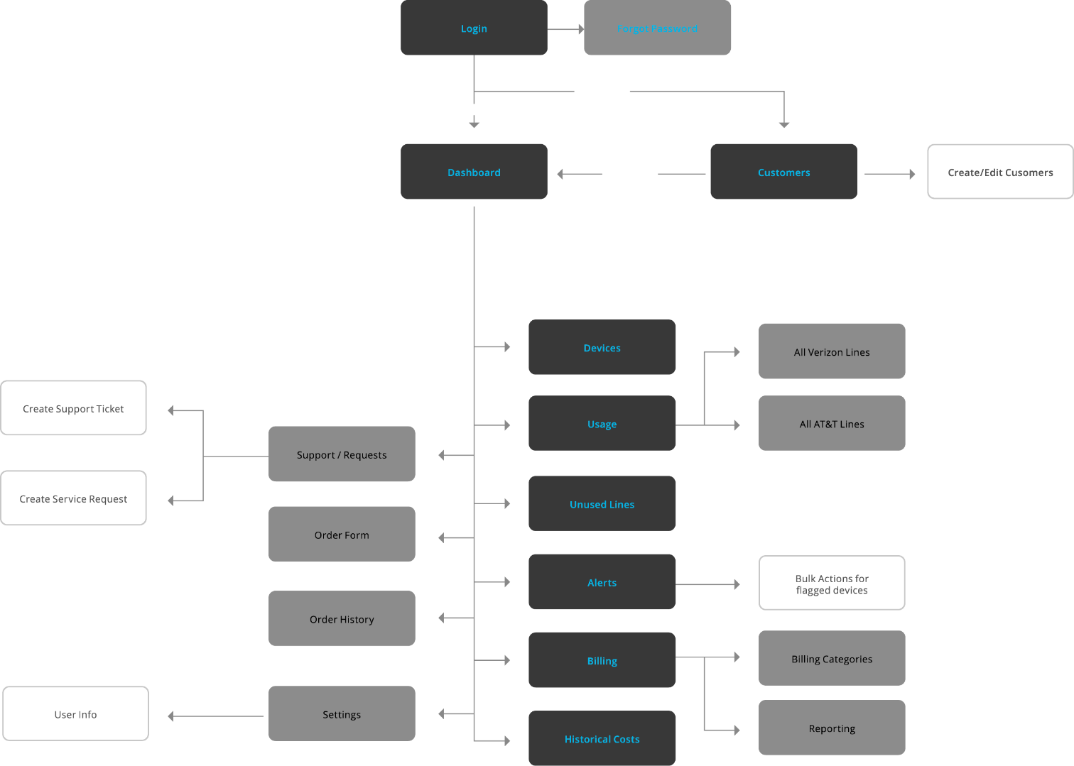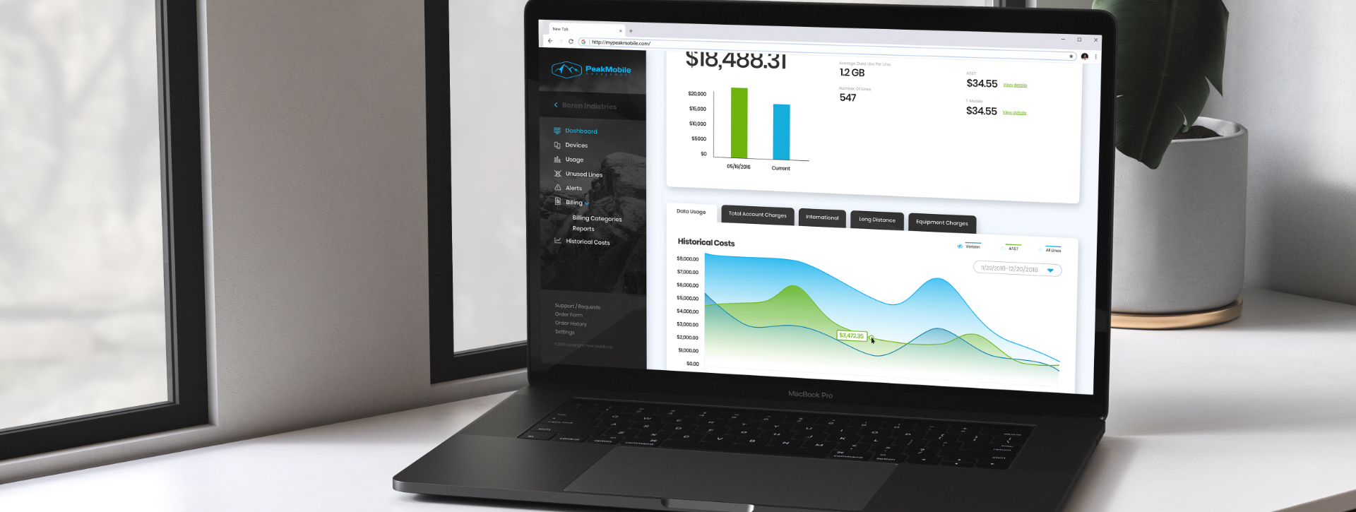 PeakMobile offers an extensive cell phone carrier and billing management platform. Their software aggregates usage data and allows companies to manage phone plans that their employees use. Their existing software has a poor navigational experience with many redundant user flows and unclear objectives. My task was to rework the entire software and accomplish 2 primary goals.